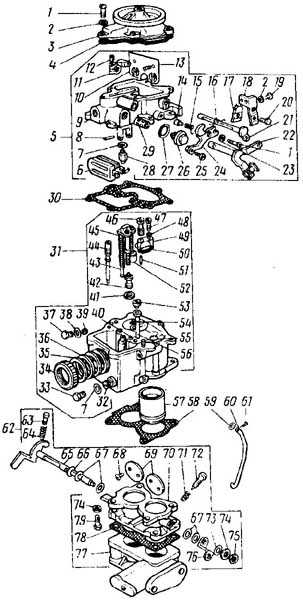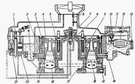 Эти составляющие располагаются в корпусе поплавковой камеры. Сам корпус камеры вылит из сплавов с цинком, а корпус для смесительных камер изготовлен из алюминия. Между корпусами камер и крышкой проложена прокладка из картона.