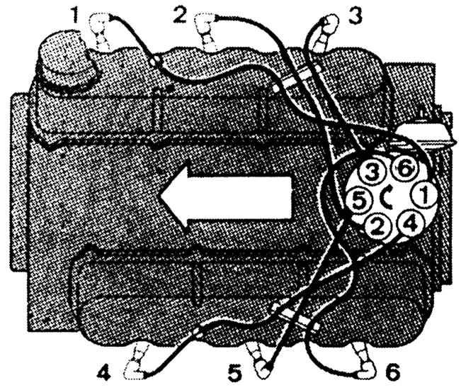 Убедитесь, что бегунок расположен против контакта крышки первого цилиндра и проверьте правильность подсоединения высоковольтных проводов остальных цилиндров – считая против часовой стрелки с первого цилиндра в порядке 1–2–4–3.