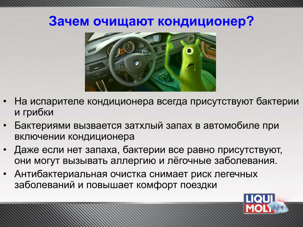 Кондиционер является неотъемлемой составляющей комфортной жизни человека — неважно, установлен он в квартире или в салоне автомобиля. Однако со временем уличная пыль, попадающая в кондиционер вместе с воздухом, оседает на фильтре и на испарителе и, как следствие, создает отличную среду для размножения микробов, бактерий и грибков. Чтобы прибор работал эффективно и не наносил вреда здоровью, ему следует обеспечивать тщательный и регулярный уход. Вместе со специалистами компании Liqui Moly рассказываем об очистителе кондиционеров Klima Anlagen Reiniger: что он из себя представляет, в чём его особенности и какие проблемы он может решить.Что такое Klima Anlagen Reiniger