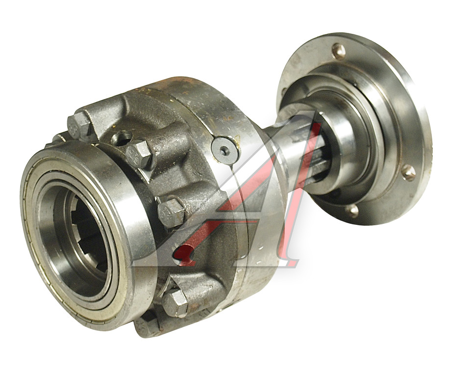 Между половинами корпуса зажата крестовина, на шипах которой установлены четыре сателлита с опорными шайбами. Сателлиты находятся в зацеплении с шестернями привода среднего и заднего мостов.