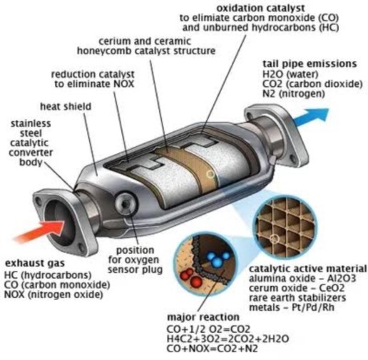 Недогоревшие остатки (CO, CH, NO) касаясь поверхности каталитического слоя, окисляются до конца кислородом, присутствующим также в выхлопных газах.