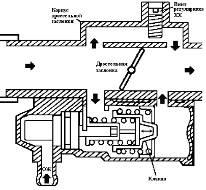 Так как в неподвижном положении транспортного средства акселератор остается нетронутым, пропуск кислорода через заслонку невозможен. Эту проблему решает дополнительный канал подачи воздуха.