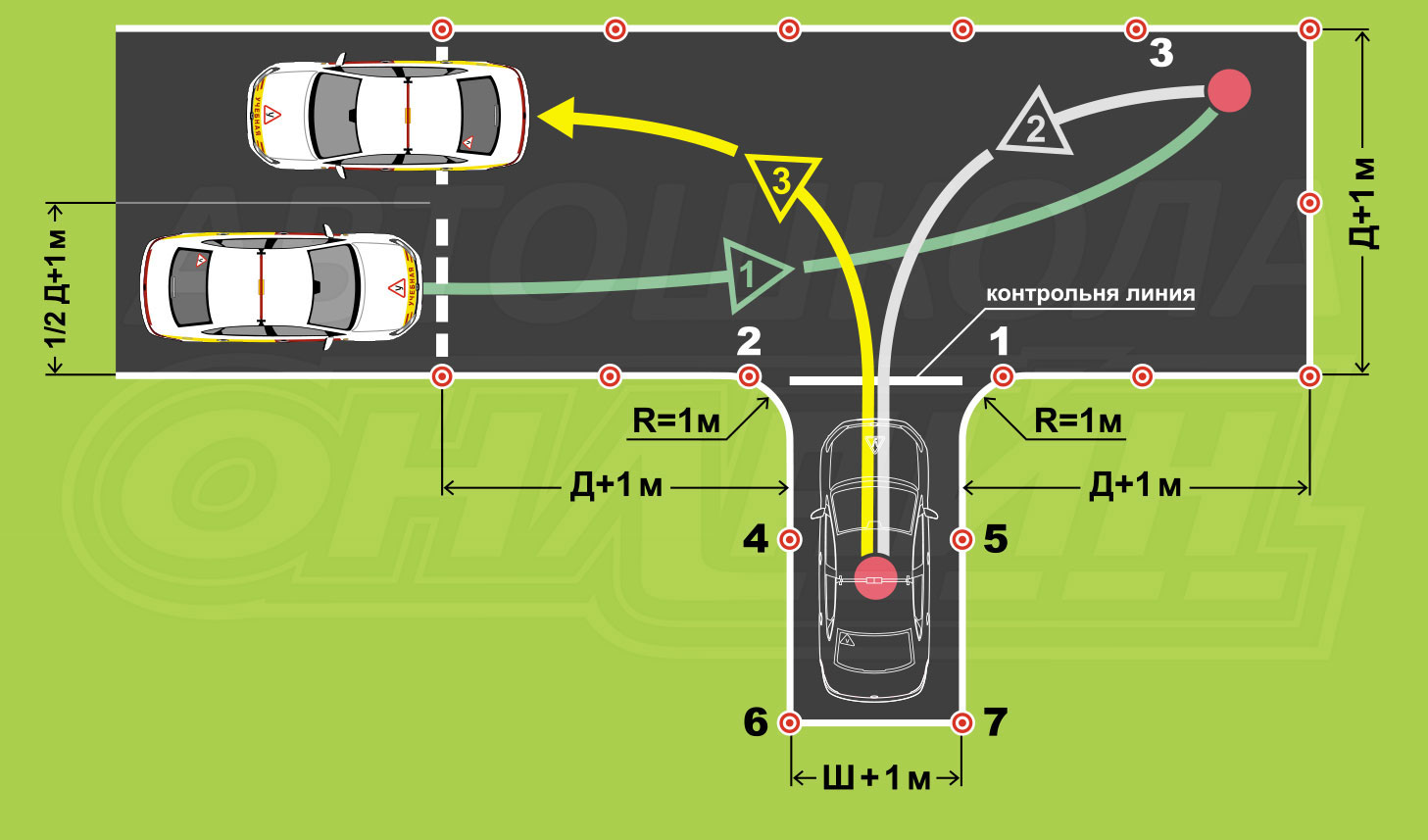 - Сделать разворот в ограниченном пространстве, двигаясь задним ходом