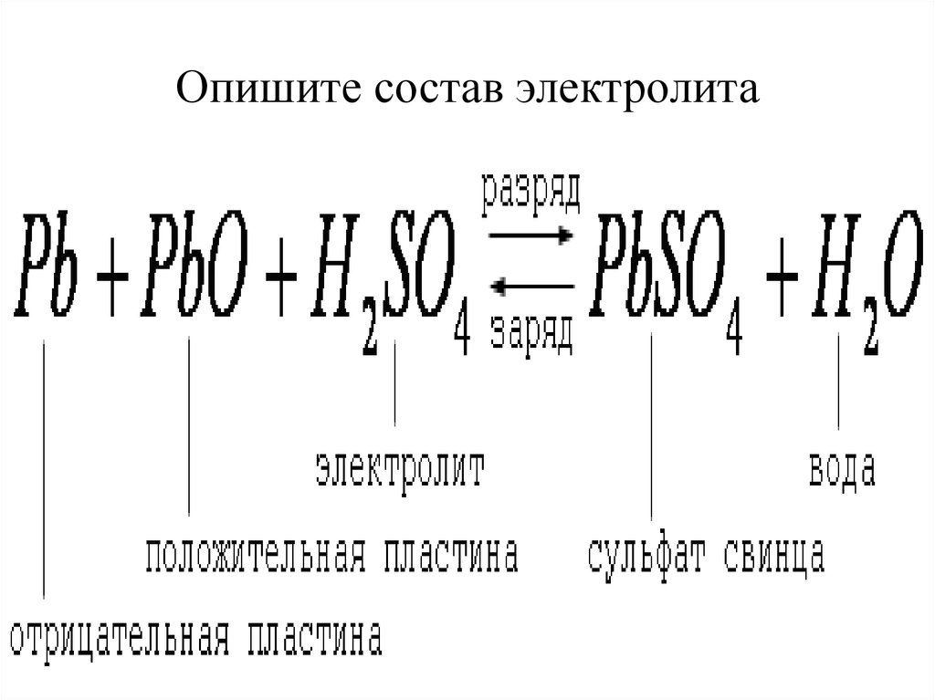 Один электрод сделан из диоксида свинца, и когда свинец переходит в раствор, электроны перетекают от этого электрода к другому электроду, где молекулы диоксида свинца принимают электроны и превращаются в газообразный кислород. Оба электрода находятся в растворе электролита, способном поддерживать электрический поток между электродами. Требования к электролиту: высокая диссоциативность в растворе и способность служить носителем заряда. В свинцово-кислотном аккумуляторе электролитом являются серная кислота и вода. Он также поставляет ионы сульфата, необходимые для высвобождения молекул кислорода в раствор.