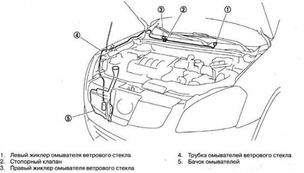 - Снимаются форсунки лобового стекла, стоящие на пластиковых зажимах (для этого необходимо разжать зажимы и, надавив на жиклер снизу, вытолкнуть его вверх).