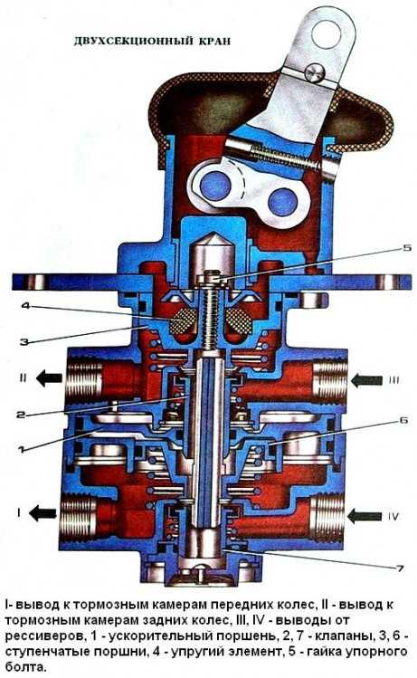 Выводы I и II крана через промежуточные пневмоаппараты соединены с тормозными камерами соответственно передних и задних колес, выводы III и IV — с ресиверами раздельных контуров привода рабочего тормоза.