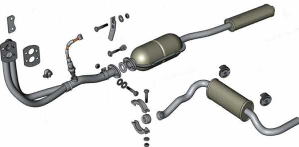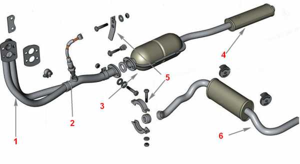 В общем, если систему вывода отработанных газов разобрать на элементы, то с конца получится следующая последовательность: глушитель; глушитель дополнительного назначения; катализатор; лямбда-зонд; приемная трубка. Соединение элементов происходит посредством вспомогательных трубок и крепежных хомутов.
