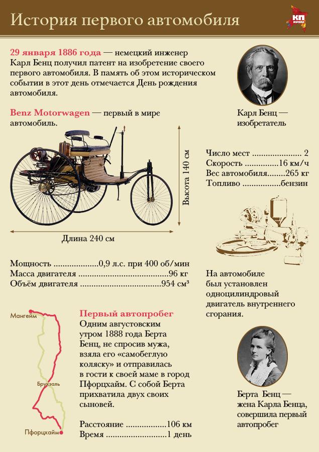 В 1885 году немецкий инженер-механик, Карл Бенц разработал и построил первый в мире автомобиль работающий с двигателем внутреннего сгорания. 29 Января 1886 года, Бенц получил первый патент (DRP№37435) для бензиновых автомобилей.