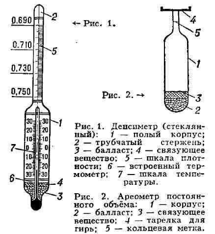 Ареометр — это стеклянный поплавок, расширяющийся вниз и наполненный увесистой массой — балластом, работающий согласно закону Архимеда.