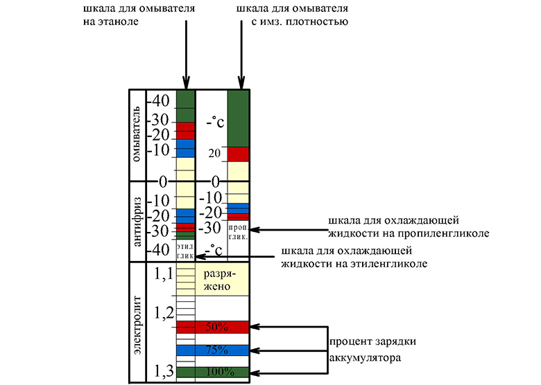 Применяют кое-какие виды ареометров для замера кислотности и температуры тосола. Устройство заключает в себя: