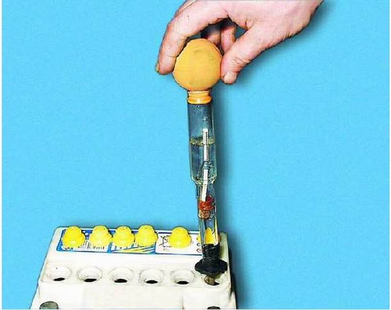 Необходимо вывернуть все заглушки аккумуляторных ячеек. - Взять прибор и спустить вертикально в ячейку аккумулятора. Прибор выглядит, как стеклянная колба, в которой имеется поплавок – ареометр со шкалой, а на окончании прибора резиновая груша для отбора электролита. Набираем некоторое количество кислоты, чтобы ареометр плавал без затруднений. Смотрим на шкалу, снимаем показания. У электролита с большой плотностью поплавок плавает выше. Единица замера плотности – килограмм на кубический дециметр, литр.