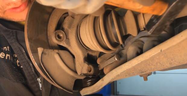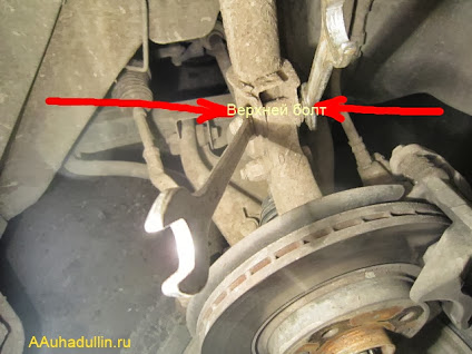7. Выбиваем верхний болт и отделяем ухи крепления стойки от кулака.