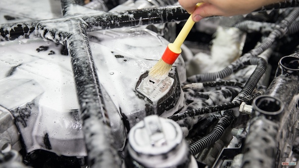 В ходе эксплуатации машины, на «сердце автомобиля» проливается моторное масло, антифриз, вода, вся эта въевшаяся субстанция, вперемешку с пылью, затрудняет процесс мойки. Там, где губка не достает, используйте зубную щетку или кисть.