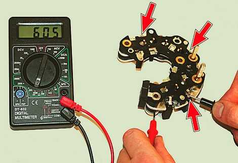 Чтобы проверить диодный мост генератора мультиметром, нужно включить прибор в режим проверки полупроводников – звуковой сигнал при подключенном в прямой полярности диоде скажет о том, что диод не перегорел. При подключении же в обратной полярности такой звук будет свидетельствовать о том, что диод «пробит». Но иногда неисправные диоды можно увидеть невооружённым глазом – случается, их разрывает пополам.