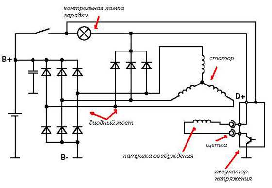 Вращающийся ротор, на обмотку которого через меднографитные щётки подаётся электрический ток (для создания электромагнитного поля), порождает ЭДС в обмотке статора, «плюсовой» вывод (на рис.2 «В») которой соединён с АКБ, а отрицательный – с «массой».