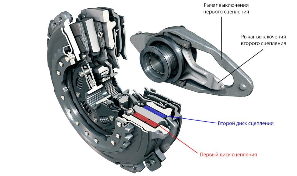 Рабочий узел состоит из 4-х валов (2 первичных и 2 вторичных). Они оснащены шестеренками переключения передач. Первая пара валов отвечает за четные передачи, а вторая — за нечетные и задний ход. При этом каждая пара обладает своим сцеплением.
