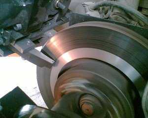 Проточка тормозных дисков со снятием осуществляется на стационарном станке. Обработка производится одновременно с двух сторон, при этом плоскость обработки соответствует плоскости притирания колодок.