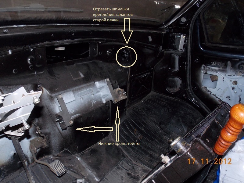 - Затем откручиваем болты крепления отопителя к машине со стороны двигателя.