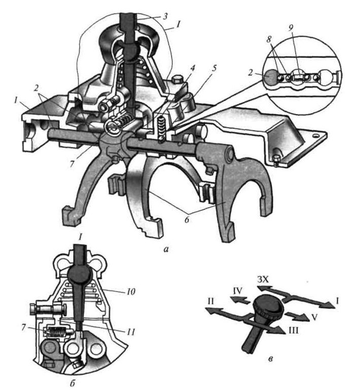 Синхронизаторы обеспечивают бесшумность при включении. Разность частот вращения муфты синхронизатора и включения шестерни плавно уравнивается за счет возникающей между ними силы трения. Механизм переключения передач имеет блокирующее устройство, которое удерживает тяги переключения в нужном положении.