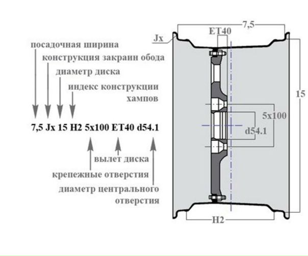 Маркировка будет более понятной, если для её расшифровки использовать приведённый нами рисунок. В качестве примера давайте рассмотрим такой вариант маркировки, как 7,5Jx15h35x100ET40d54.1. А каким образом он соотносится с конструкцией колёсного диска, смотрите на рисунке справа:
