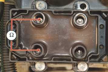 3. Для проверки нам понадобится тестер. Тестером в режиме омметра измеряем сопротивление на парных высоковольтных выводах модуля зажигания 1 и 4 цилиндром; и между 2 и 3 цилиндром. Сопротивление должно быть одинаковым о варьироваться в районе 5,4 кОм.