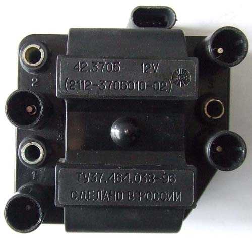 Конструктивно модуль зажигания 2112- 37050010 представляет из себя блок с электрическим разъемом, который состоит из двух двухвыводных катушек зажигания. В верхней части катушки находятся четыре высоковольтных вывода.