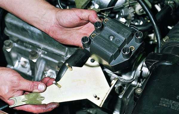 Отсоединяем наконечники высоковольтных проводов. Ключом на «13» отворачиваем два верхних болта крепления, ключом на «17» ослабляем затяжку нижнего болта. Снимаем модуль вместе с его кронштейном.