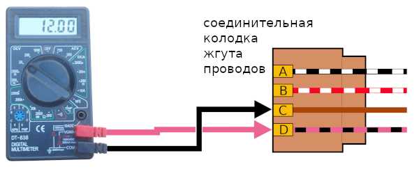 Если предыдущие проверки не выявили неисправности необходимо проверить подачу напряжения на модуль зажигания. Включаем зажигание. Мультиметром в режиме вольтметра замеряем напряжение между выводами «С» и «D» колодки жгута проводов идущих к модулю (выводы промаркированы на самой колодке). Напряжение должно находиться в пределах напряжения бортовой сети автомобиля (12В). Если оно меньше или отсутствует, то возможно разряжена аккумуляторная батарея, неисправны провода от ЭБУ к модулю зажигания или неисправен блок управления (ЭБУ).