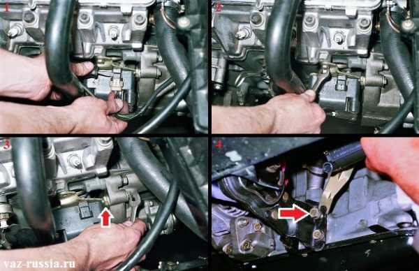 1) Снимается модуль не тяжело, но вот с его проверкой будут проблемы, потому что для этого во-первых специальное оборудование нужно, хотя и при помощи обычного мульти-метра можно проверить модуль на работоспособность (О том как модуль можно проверить мы опишем в этой же статье), но для начала его нужно снять, для этого сперва отсоедините колодку проводов от модуля (см. фото 1) которая крепиться к нему за счёт фиксатора, поэтому фиксатор на колодке ещё отогнуть не забудьте, иначе можно отломать её, как только колодка будет отсоединена берите в руки гаечный ключ и с его помощью отверните полностью верхний болт (см. фото 2) крепления модуля, затем боковую гайку выворачивайте (см. фото 3, указана красной стрелкой она) болта и чтобы болт не потерять, можете вынуть его так же, ну и в завершение переберитесь по ниже (Под автомобиль если можете) и там разыщите последний болт крепления модуля в нижней части (см фото 4, болт указан стрелкой), данный болт немножко ослабьте и после чего полностью снимите модуль зажигания с автомобиля, при этом отсоедините от него все четыре провода которые к нему подсоединены, а иначе они не дадут вам снять модуль с автомобиля.