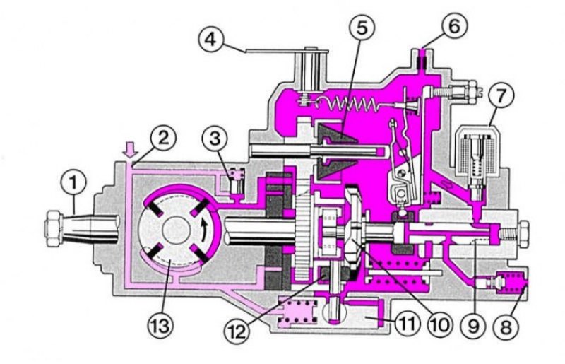 И эти один или два плунжера обслуживают все цилиндры двигателя, которых может быть и 4, и 6, и 8, и 12. Благодаря своей конструкции, в сравнении с рядными ТНВД, распределительный насос более компактен и меньше весит, и при этом способен обеспечить более равномерную подачу топлива.
