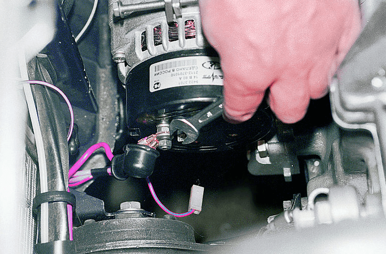 - Отсоедините от наконечников проводов на плюс резиновый колпачок, предназначенный для защиты детали. Для этого вывинтите гайку фиксации проводов, а провода снимите с корпуса генератора.