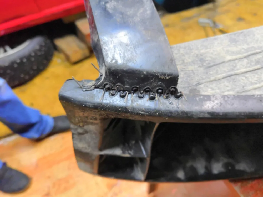 при ремонте полиуретанового бампера из-за мягкости материала трещину необходимо скрепить скобами для мебели;