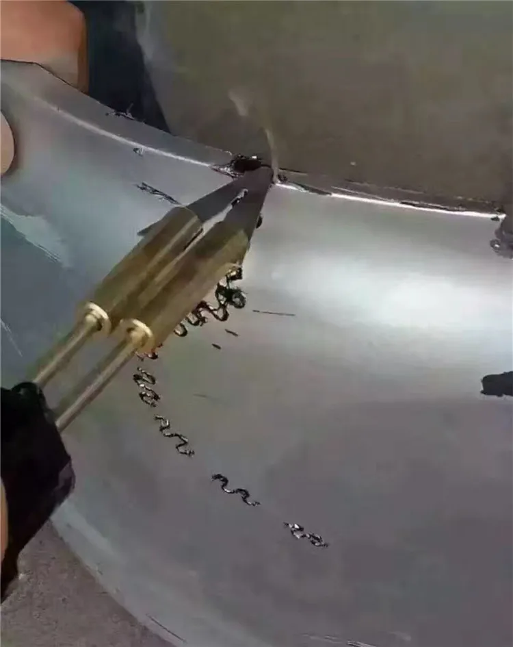 Струю горячего воздуха следует направлять так, чтобы расплавить не только планку, но и тонкие края бампера по шву. Пруток расплавляется и помещается под давлением в подготовленный паз.