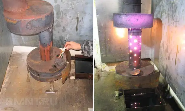 Ввариваются трубки диаметром 1,5 дюйма. Одна является продолжением другой, только немного выше; для того чтобы огонь закручивался внутри, а не сразу вылетал на улицу.