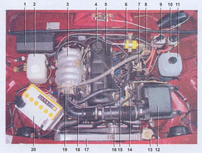 Подкапотное пространство автомобиля с впрысковым двигателем: 1 – блок реле и предохранителей; 2 – бачок омывателя ветрового стекла; 3 – ресивер; 4 – крышка маслозаливной горловины; 5 – двигатель; 6 – топливный фильтр; 7 – главный тормозной цилиндр; 8 – вакуумный усилитель тормозов; 9 – бачок гидропривода тормозов; 10 – бачок гидропривода выключения сцепления; 11 – расширительный бачок системы охлаждения двигателя; 12 – воздушный фильтр; 13 – пробка радиатора; 14 – катушка (модуль) зажигания; 15 – указатель уровня масла в двигателе; 16 – электровентилятор радиатора; 17 – радиатор; 18 – рукав подвода воздуха к корпусу дроссельной заслонки; 19 – корпус дроссельной заслонки; 20 – аккумуляторная батарея
