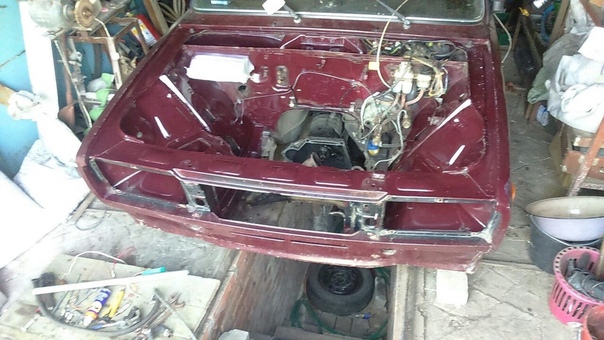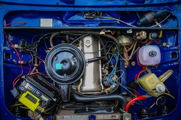 Приступил к разборке подкапотки, срубил место под аккумулятор, зачистив всю ржавчину до металла приступил к сварке ненужных отверстий, далее приступил к шпаклеванию, чтобы убрать все следы сварки и неровностей, а после следовала сборка и прокидывание проводки в крыльях, вся проводка помещена в гофру и прикреплена к самому верху арки, аккумулятор в багажник на место запаски в специально сваренное для него место, закрытого типа с вентиляцией на улицу, чтобы в салон не попадали его пары, после всей сборки и покраски некоторых элементов, запустил двигатель, проверил всю работоспособность электроники, и как не странно все работало как и должно.Для повседневной езды с капотом, пришлось оставить черепаху с нуливиком т.к капот с квадратным нулевиком не зарывается из за того что он выше чем черепаха, да и из за поднятой балки.Теперь подкапотка выглядит намного свежее чем была.