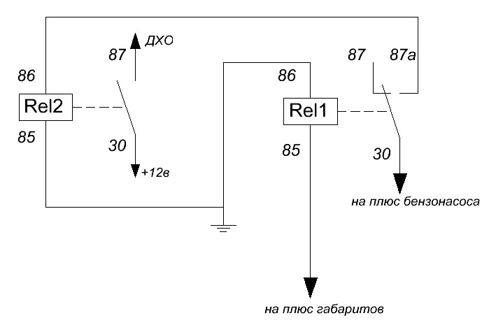 Если приобретение специального контроллера не планируется, целесообразно отдать предпочтение варианту подключения через реле. Оно предполагает использование 5 контактного реле, которое будет задействовано в общей схеме подключения ДХО. Подобная схема позволяет исключить любые недостатки, свойственные предыдущим вариантам и дает возможность безопасного использования ДХО без какого-либо дополнительного оборудования.