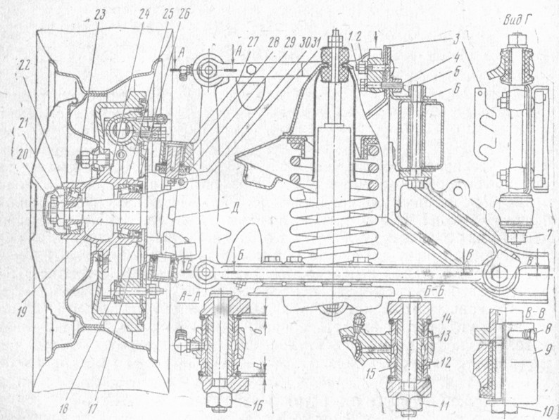1 — тормозной диск; 2 — ступица; 3 — манжета; 4 — внутренний подшипник ступицы; 5 — колпак ступицы; 6 — цапфа; 7 — гайка ступицы; 8 — наружный подшипник ступицы; 9 — корпус скобы дискового тормоза; 10 — тормозной щит; 11 — поворотный кулак; 12 — болт крепления верхней шаровой опоры; 13 — верхняя шаровая опора; 14 — верхний рычаг; 15 — резиновый буфер хода отдачи; 16 — резиновая прокладка пружины; 17 — амортизатор; 18 — верхняя опорная чашка пружины; 19 — шайбы подушек; 20 — гайки крепления штока амортизатора; 21 — подушки амортизатора; 22 — шпилька крепления оси верхнего рычага; 23 — регулировочные прокладки; 24 — болт крепления оси верхнего рычага; 25 — планка крепления оси верхнего рычага; 26 — планка крепления балки; 27 — кронштейн крепления подвески к лонжерону; 28 — болт крепления балки переднего моста к лонжерону; 29 — лонжерон; 30 — кронштейн опоры двигателя; 31 — балка (поперечина) передней подвески; 32 — задняя часть нижнего рычага; 33 — пружина; 34 — нижняя опорная чашка пружины; 35 — шарнир амортизатора; 36 — болт (с высокой головкой) крепления чашки амортизатора, ограничивающий ход сжатия; 37 — резиновый буфер хода сжатия; 38 — поворотный рычаг; 39 — нижняя шаровая опора; 40 — болт крепления нижней шаровой опоры; 41 — болт, стягивающий части нижнего рычага; 42 — передняя часть нижнего рычага; 43 — болт крепления нижнего рычага к балке; 44 — сайлентблок нижнего рычага; 45 — болт крепления верхнего рычага; 46 — сайлентблок верхнего рычага; 47 — ось верхнего рычага.