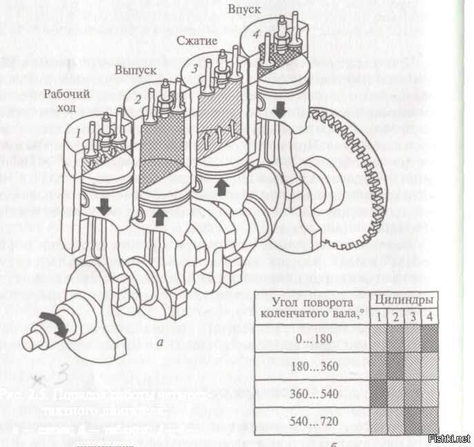 - Прежде всего, порядок работы цилиндров будет зависеть от чередования воспламенения топливной смеси в цилиндрах двигателя, а также угла чередования тактов. Так вот, рабочий цикл рядного четырехтактного мотора на 4 цилиндра проходит за 2 полных оборота коленчатого вала или же за 720 градусов. При этом чередование тактов осуществляется через 180 градусов.