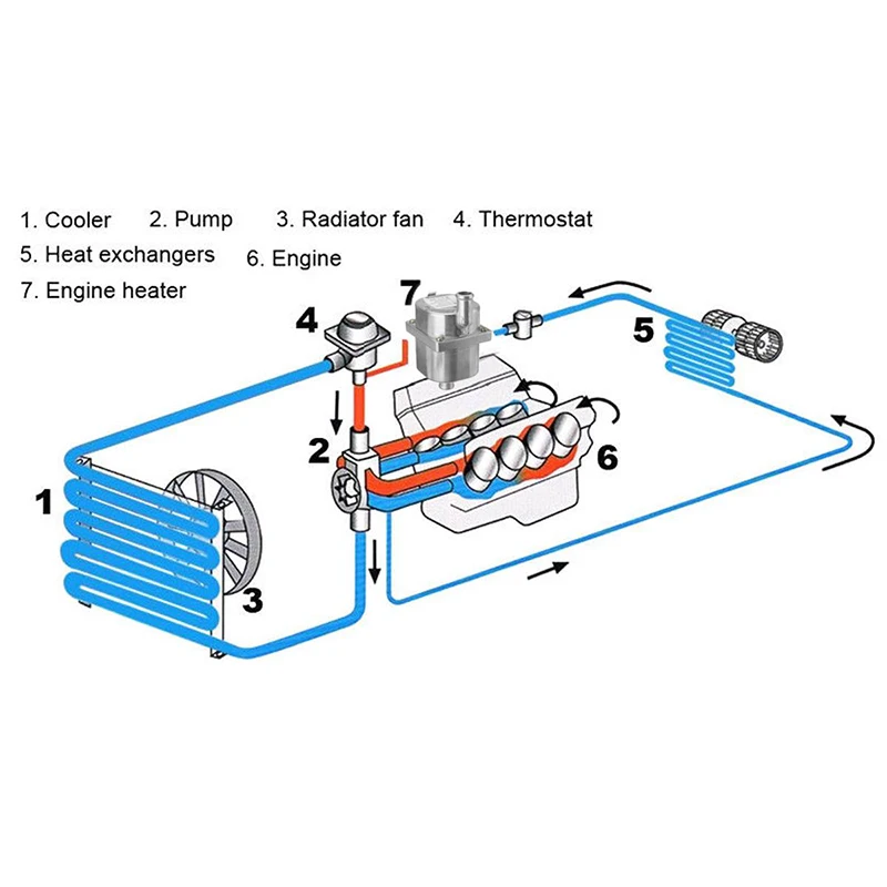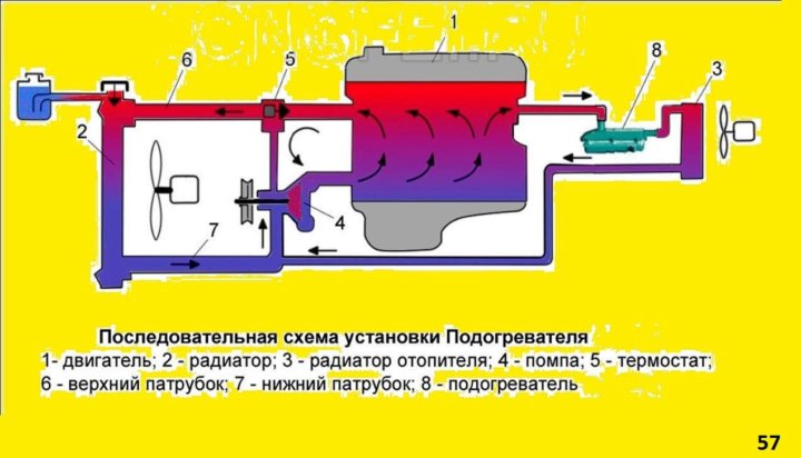 - Подогретый антифриз подается насосом в систему охлаждения двигателя.