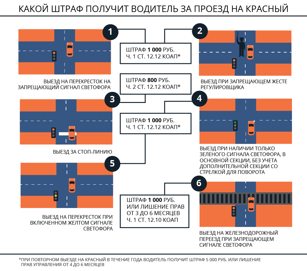 Штрафы за нарушение правил дорожного движения. В большинстве штатов и городов проезд на красный свет (или желтый свет в штатах, где это запрещено) является нарушением правил дорожного движения. В зависимости от юрисдикции за проезд на красный свет может взиматься штраф в размере от 100 до 500 долларов. Билет на красный свет обычно считается нарушением правил дорожного движения, поэтому DMV обычно регистрирует нарушение и может присвоить штрафные баллы водителю. В большинстве штатов получение слишком большого количества нарушений правил дорожного движения или штрафных баллов за определенный период времени может привести к приостановке действия лицензии.