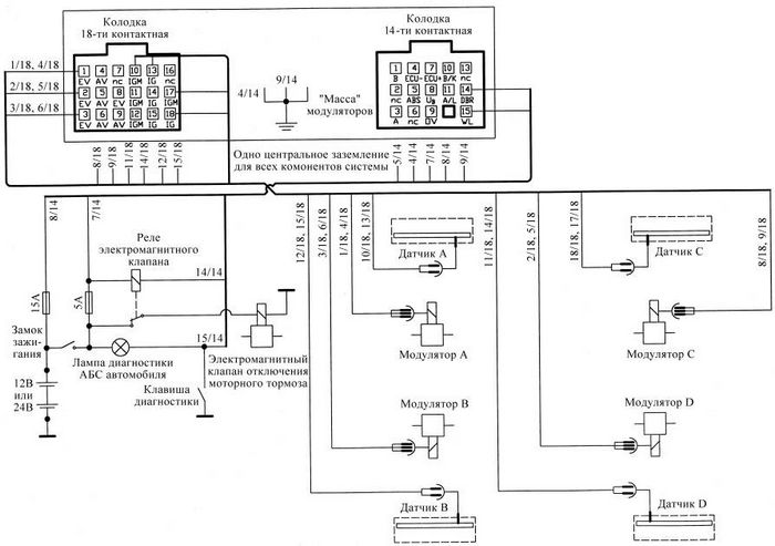При возникновении неисправности в системе или электрических цепях одного из элементов (датчиков, модуляторов и т.д.) или контуров управления загорается диагностическая лампа с символом ABS. При этом, возможно отключение соответствующего контура АБС (см. рис. Функциональная схема АБС автомобиля), и тормозная система работает как обычно (без режима АБС).