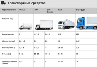 | Вид автотранспорта /параметры | Газель | Малотоннажный ЗИЛ-5301 | ЗИЛ | МАЗ | Еврофура |