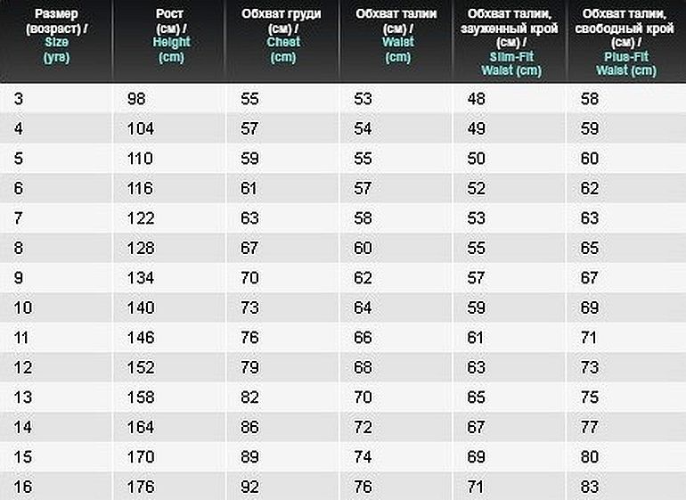 | Возраст Возраст человека (лет) Возраст, на какой рассчитана одежда. | Рост Рост человека (см) Расстояние от макушки до ступней, без обуви. Стоять необходимо ровно, ноги вместе. При невозможности стоять, замеры возможно производить лежа от макушки до ступней. | Обхват груди Обхват груди (см) Замеры необходимо производить стоя, дыхание свободное. На уровне нижнего края лопаток и по самой выступающей части груди. | Обхват талии (W) Обхват талии (см) Обхват линии талии между выступающими местами подвздошных костей и нижними рёбрами. При проведении замера рекомендуется нормально дышать (не задерживать дыхание), выпрямившись, мерочную ленту фиксировать без натяжения. | Обхват бёдер (H) Обхват бёдер (см) Обхват бедер, измеренный по наиболее выступающим точкам. |