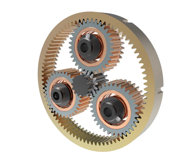 Как следует из названия, «планетарные шестерни» вращаются вокруг «солнечной шестерни». Планетарные шестерни также входят в зацепление с зубчатым венцом с внутренними зубьями, который охватывает весь набор шестерен.
