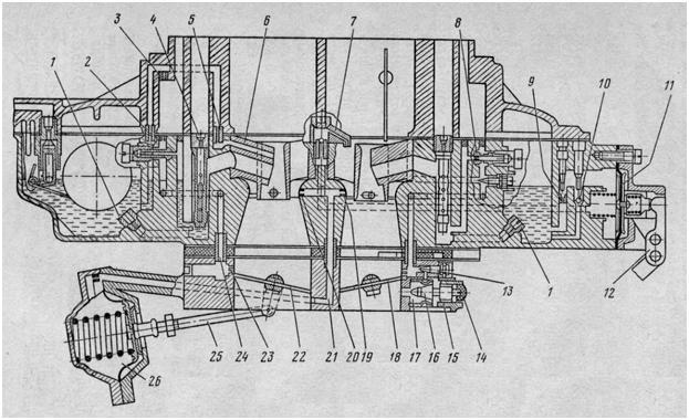 Поэтому в конструкции карбюратора, помимо двух камер, имеется: