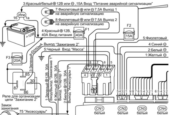 Тщательно изучив инструкцию по установке сигнализации, можно найти следующую схему подключения: