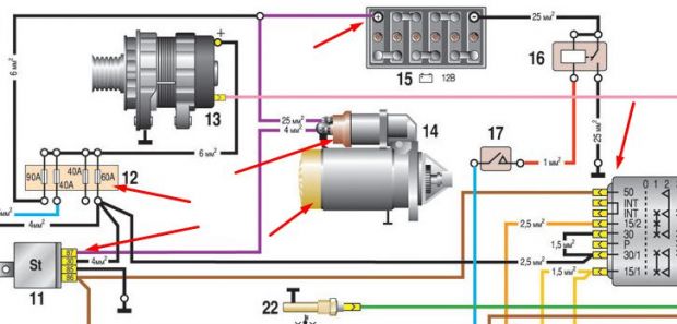Проводка в данном случае представляет собой плюсовой кабель, идущий от батареи к реле стартера, и минусовой провод, соединённый с корпусом. Проверить следует также проводок с небольшим сечением, интегрирующий стандартное реле с замком зажигания.