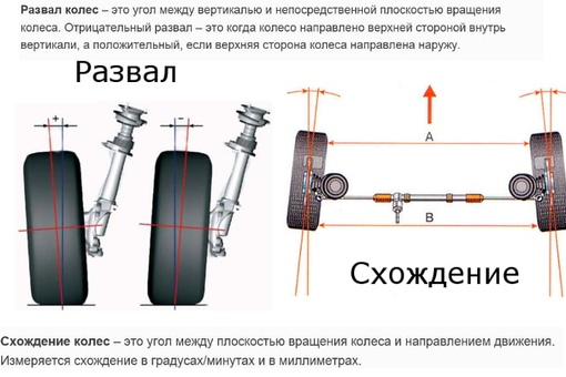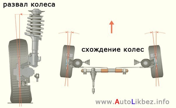 Передние колеса автомобиля (а иногда и задние) устанавливают не параллельно, а под определенными углами друг к другу. Положение колеса относительно вертикальной плоскости называется развалом колеса, а относительно горизонтальной — схождением. Схождение и развал бывают как положительными, так и отрицательными.