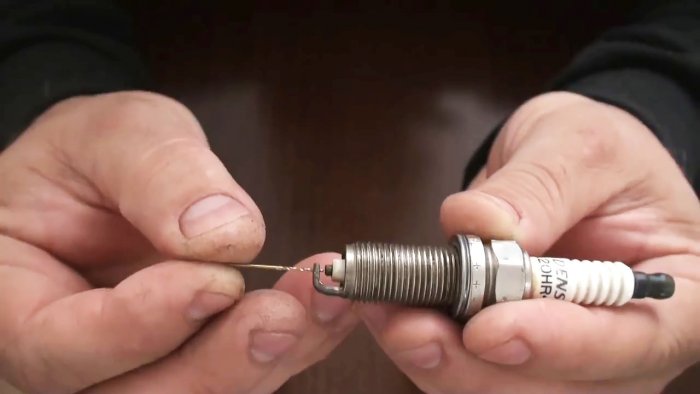 - Контакт электрода и пластинки от корпуса свечи чистят наждачкой «нулевкой». Аккуратно, не закругляя конца электрода.